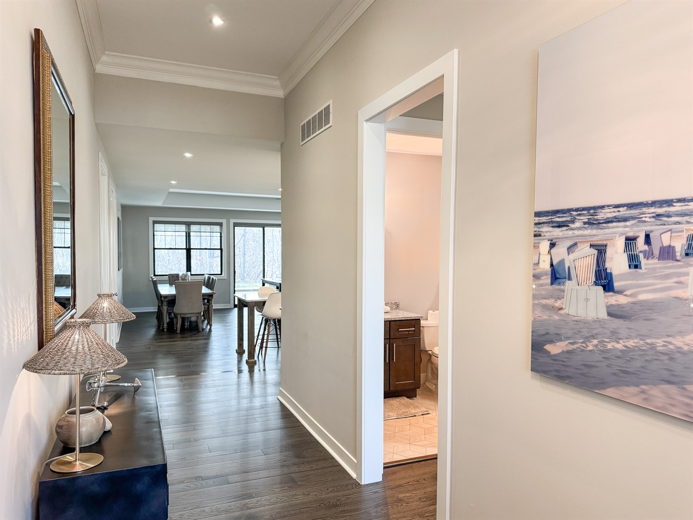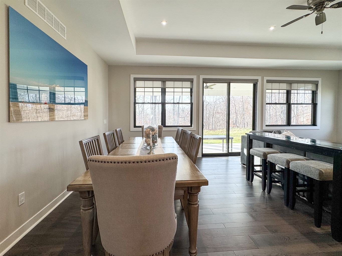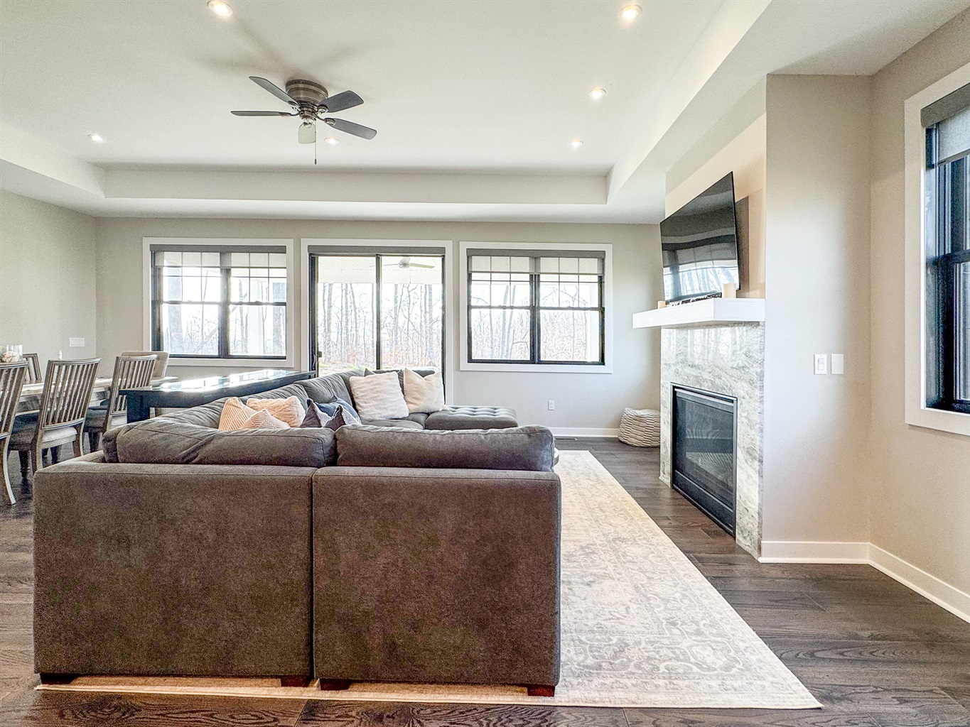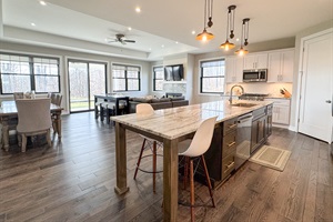 This newly constructed home features a bright, open floor plan with upscale furnishings and thoughtful details throughout. The main living area is warm and inviting, with comfortable seating, a stylish kitchen, and a dining space ideal for gathering after a day outdoors. Large windows bring in natural light and showcase the surrounding landscape.