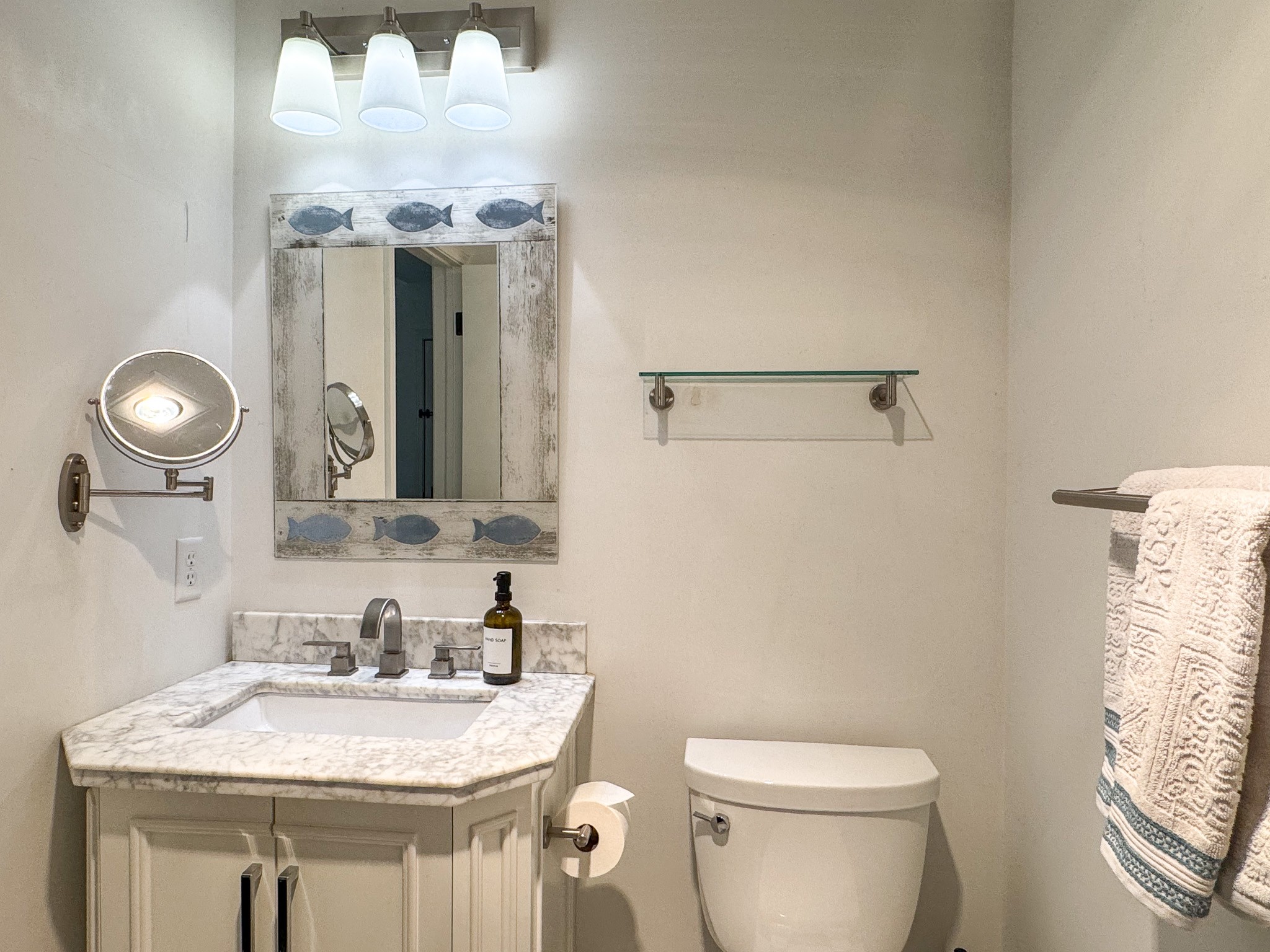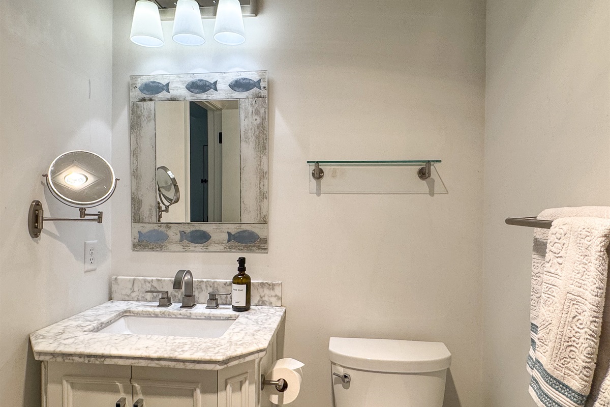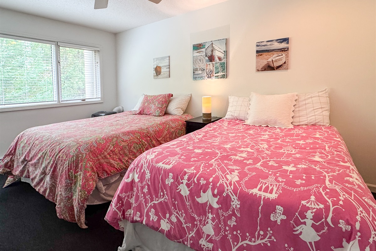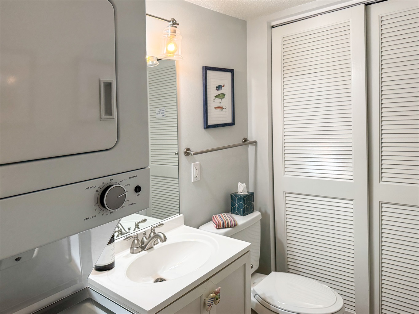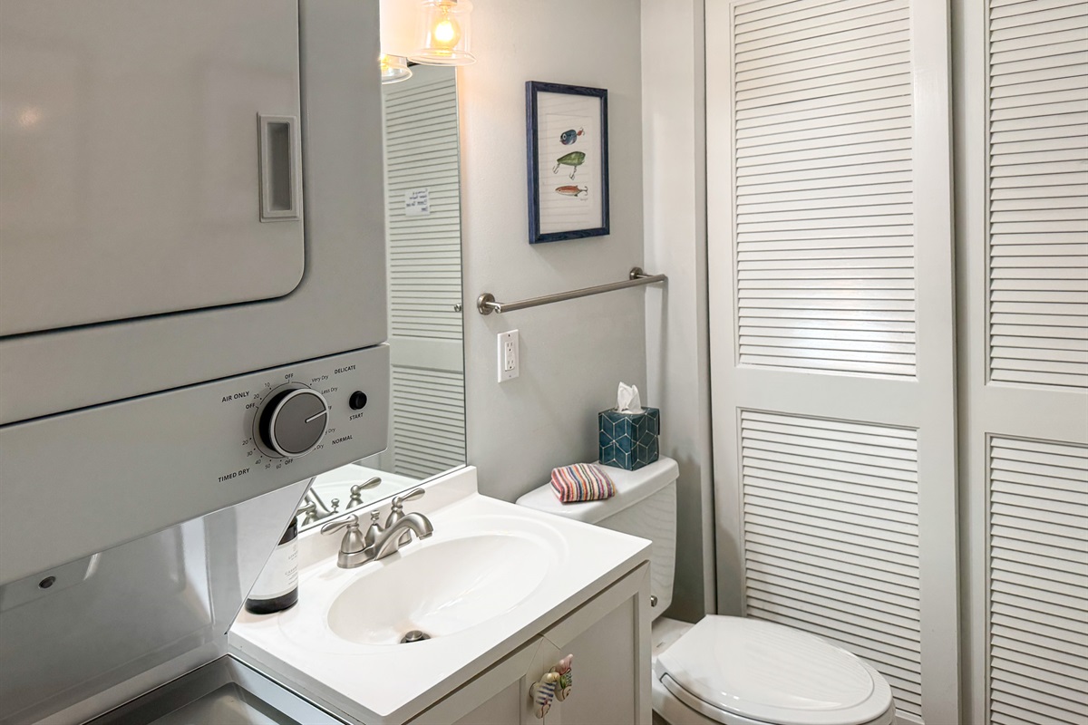 The main level features a primary bedroom with its own private bathroom, a convenient half bath, and a laundry area for guest use. Upstairs, you’ll find two additional bedrooms along with a full bath and bonus room—ideal for groups or families needing extra space. All bedrooms include air conditioning for comfort.