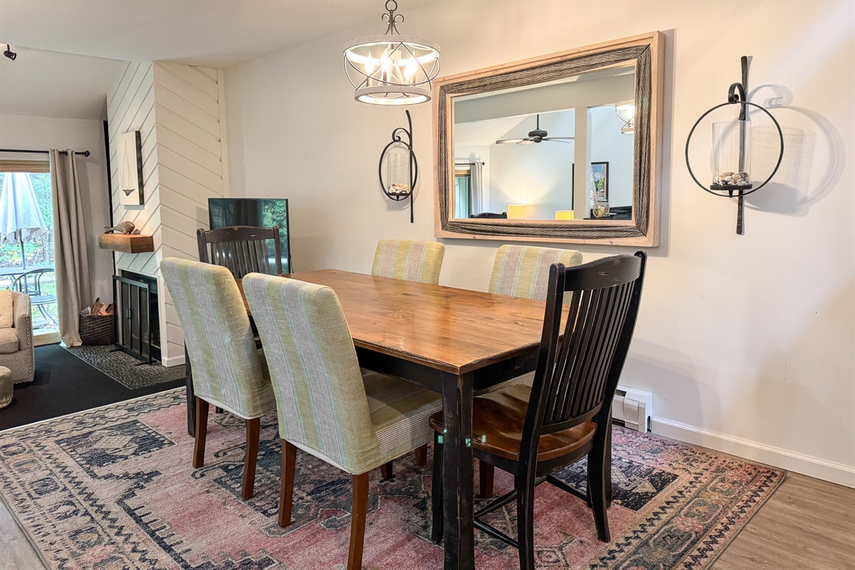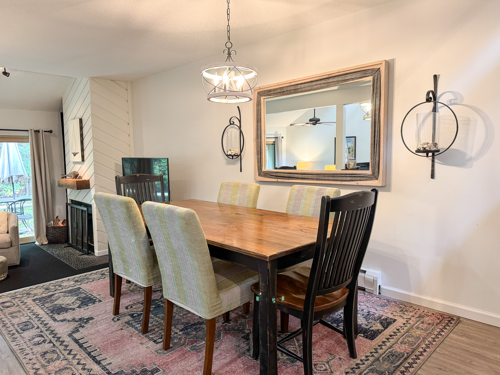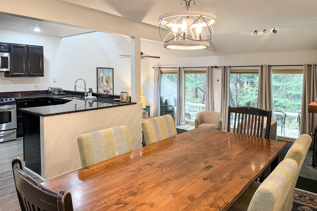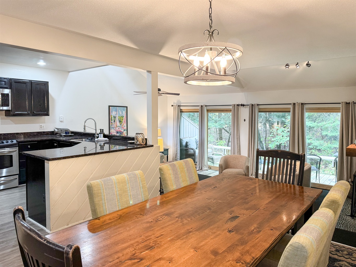 Step inside to a warm, thoughtfully furnished living area with plenty of natural light and a fireplace that sets the perfect mood after a day outdoors. The kitchen is fully stocked for cooking and opens to a spacious dining area, creating a great space for meals, game nights, or gathering with family and friends.