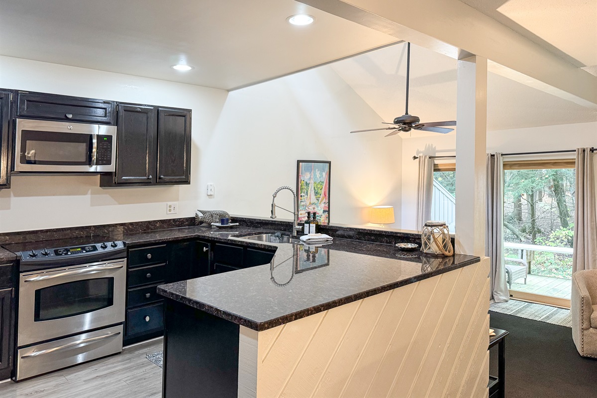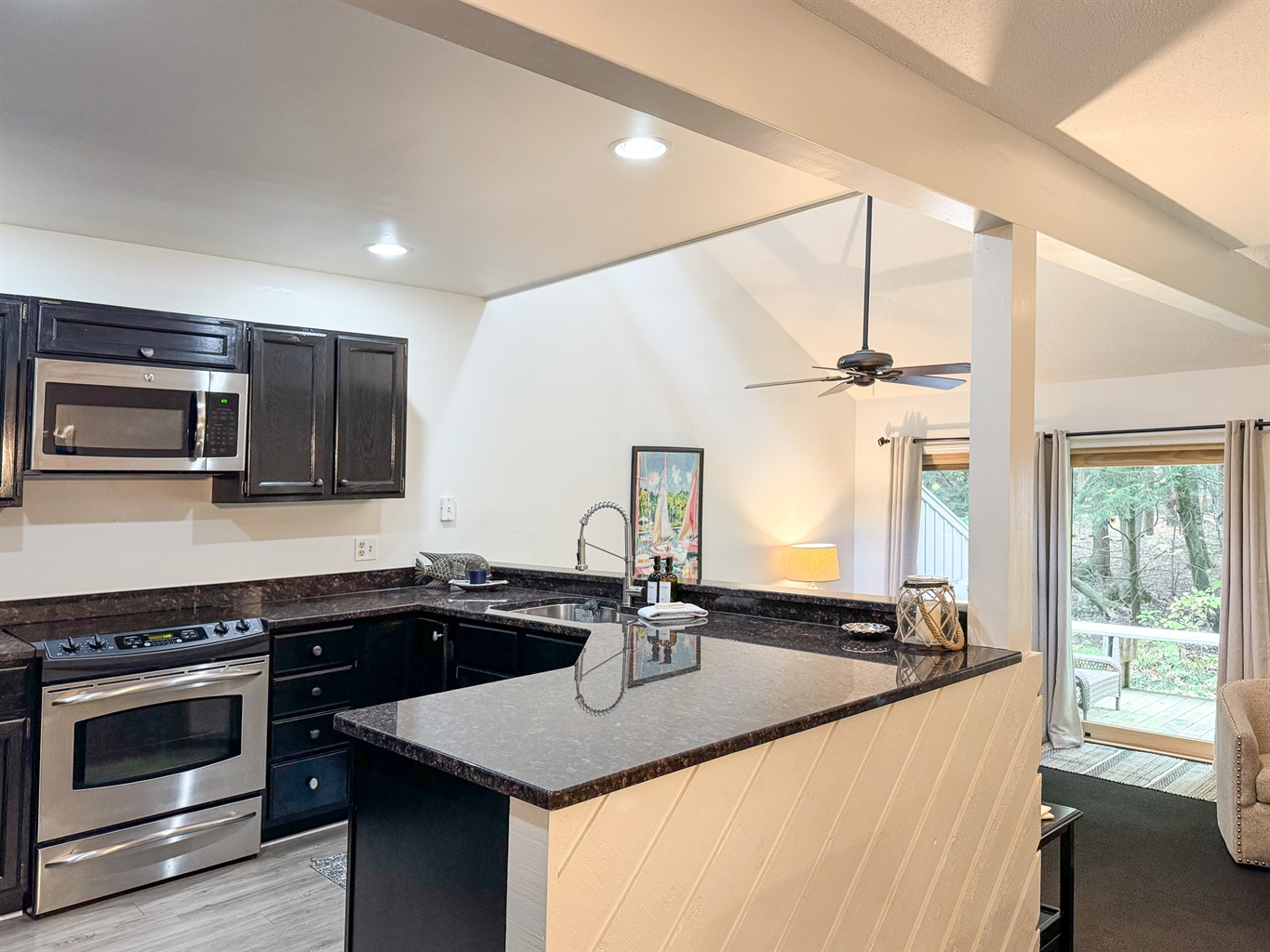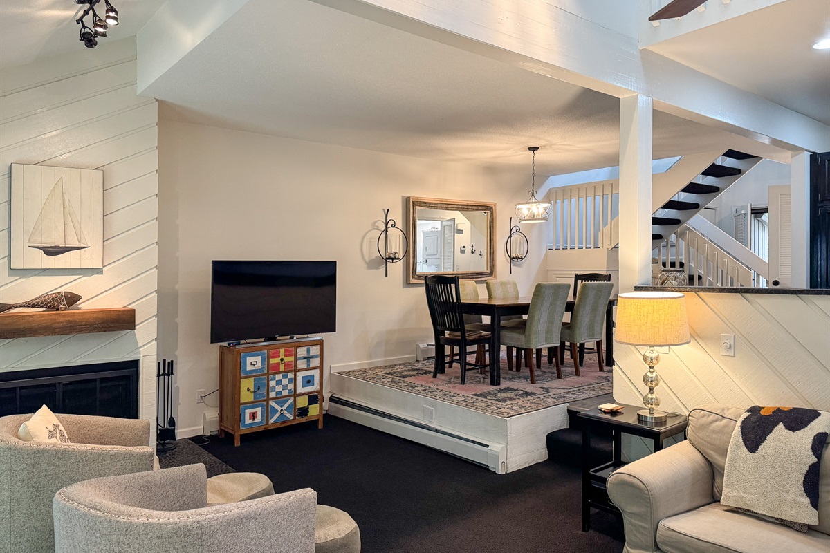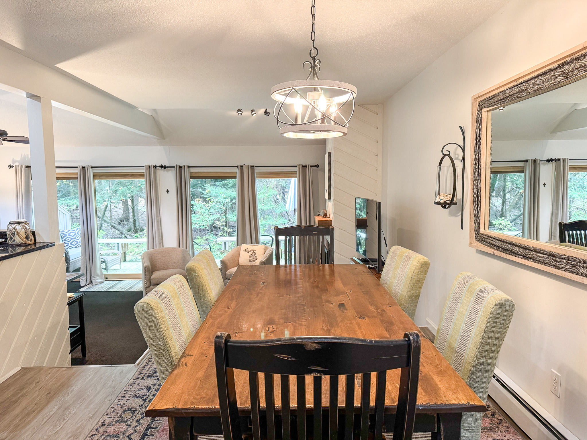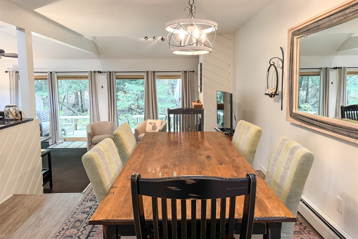 Step inside to a warm, thoughtfully furnished living area with plenty of natural light and a fireplace that sets the perfect mood after a day outdoors. The kitchen is fully stocked for cooking and opens to a spacious dining area, creating a great space for meals, game nights, or gathering with family and friends.