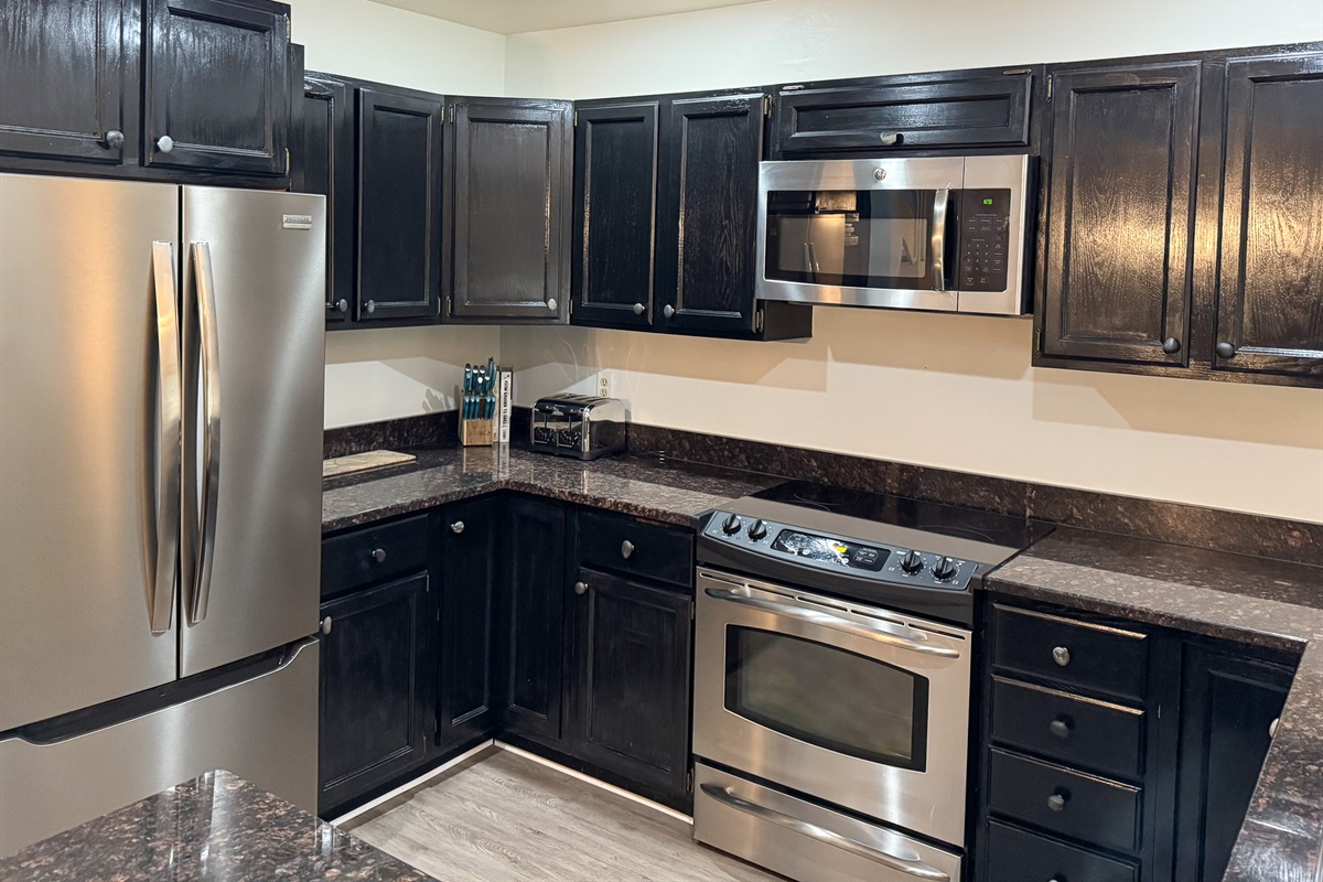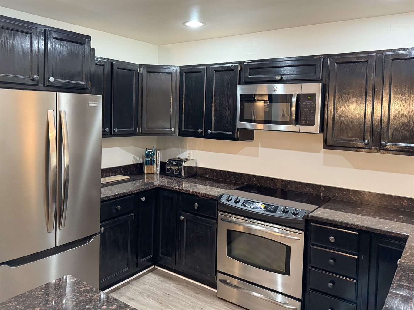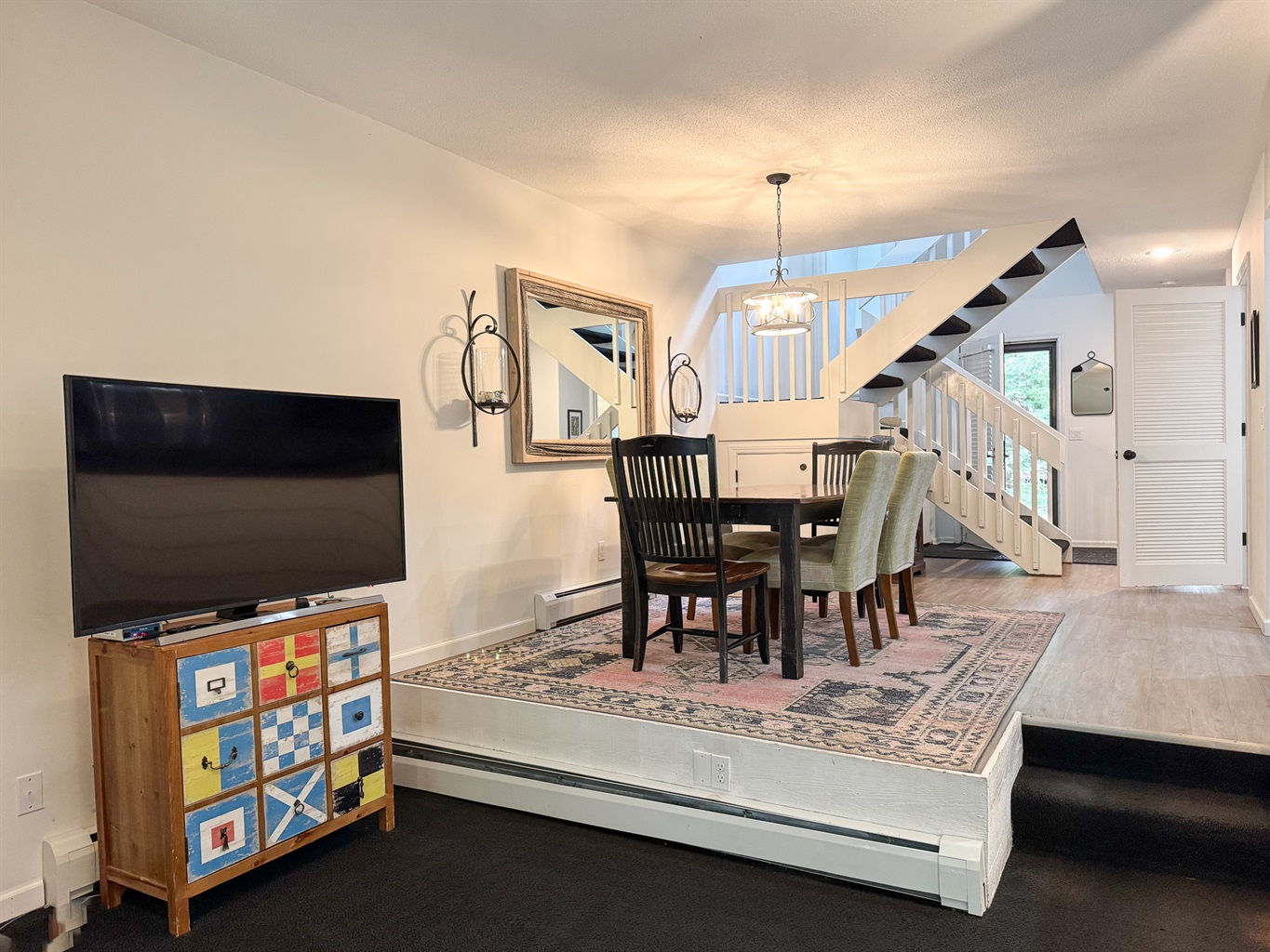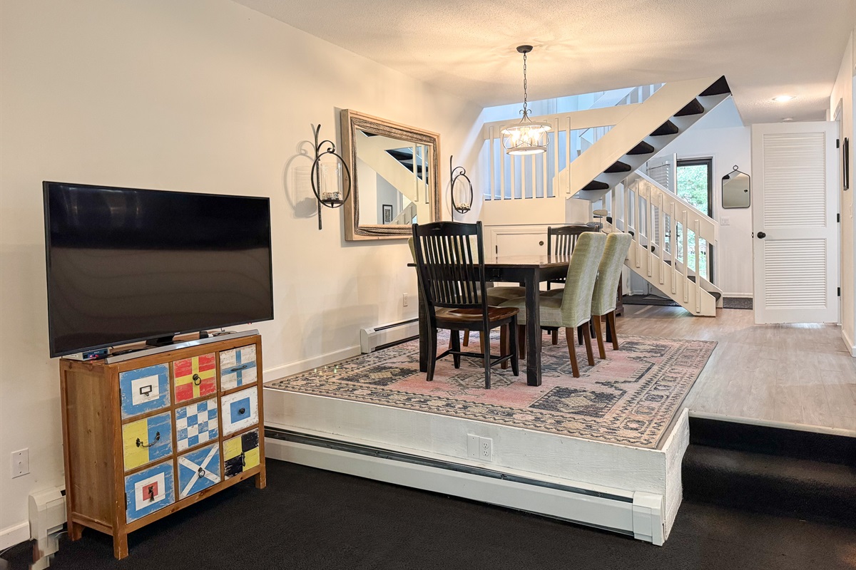 Step inside to a warm, thoughtfully furnished living area with plenty of natural light and a fireplace that sets the perfect mood after a day outdoors. The kitchen is fully stocked for cooking and opens to a spacious dining area, creating a great space for meals, game nights, or gathering with family and friends.